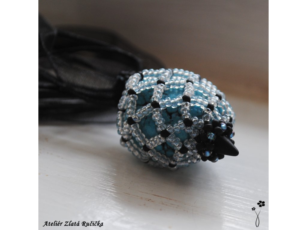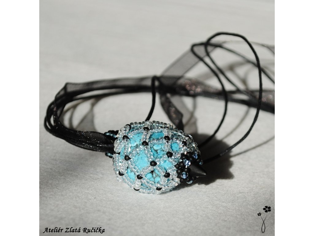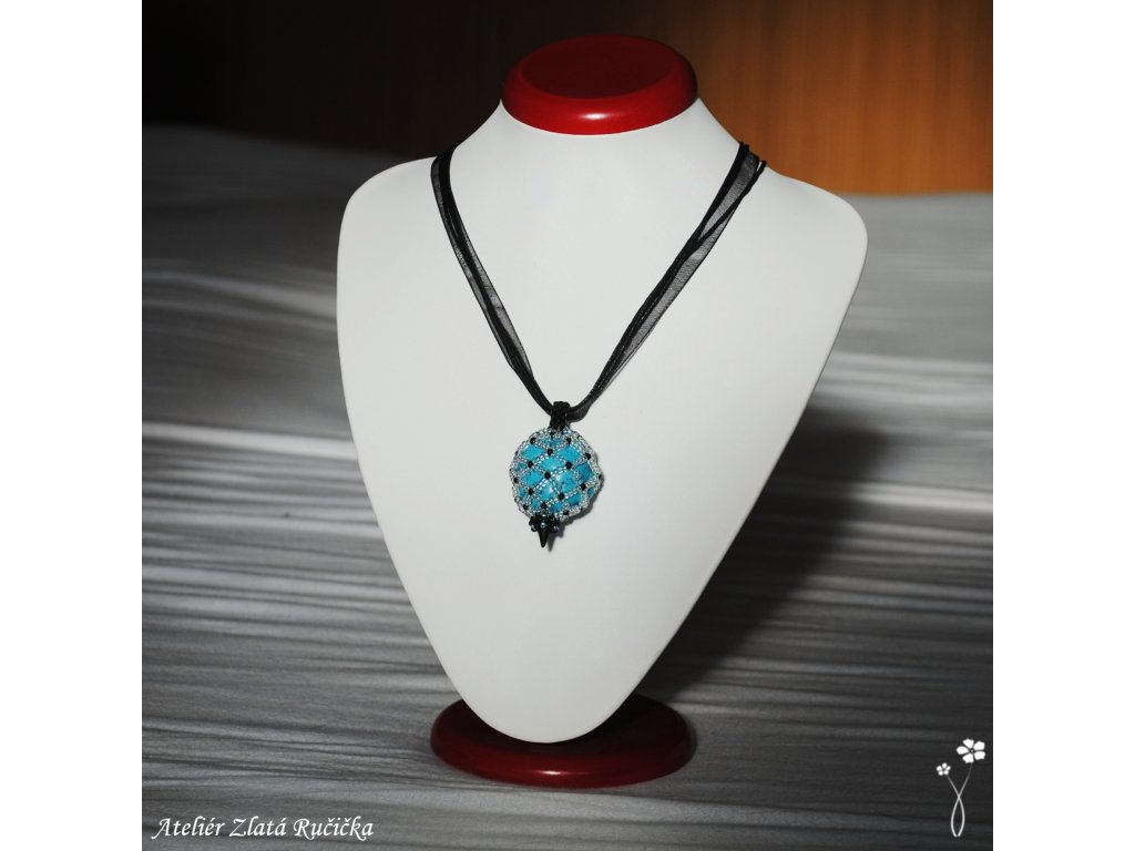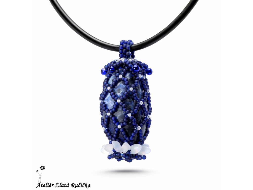 Tromlovaný kámen sodalitu je uložen v šité síťce ze skleněných rokajlových korálků. Celý přívěsek je ještě nahoře a dole ozdoben několika drobnými korálky a je zavěšen na kulaté kůži. Uzavírá se na jednoduché zapínání z tibetského stříbra.