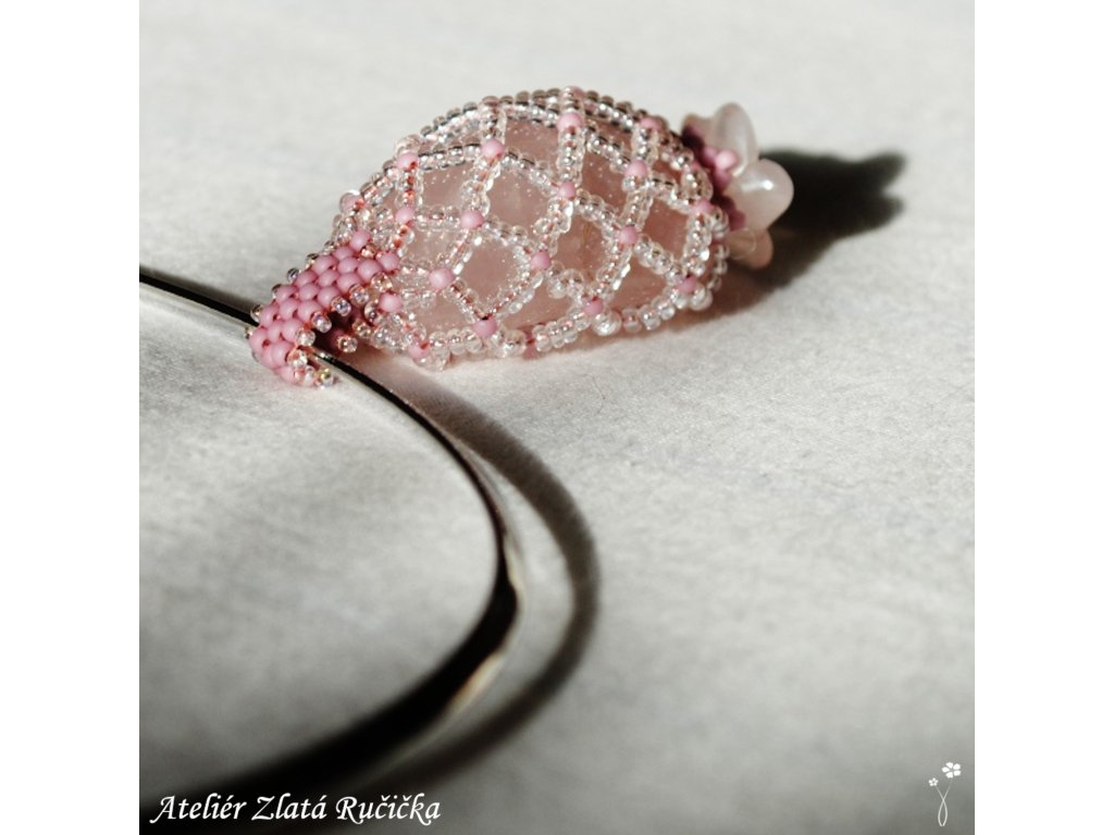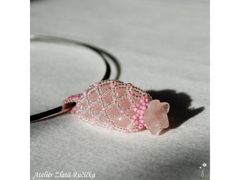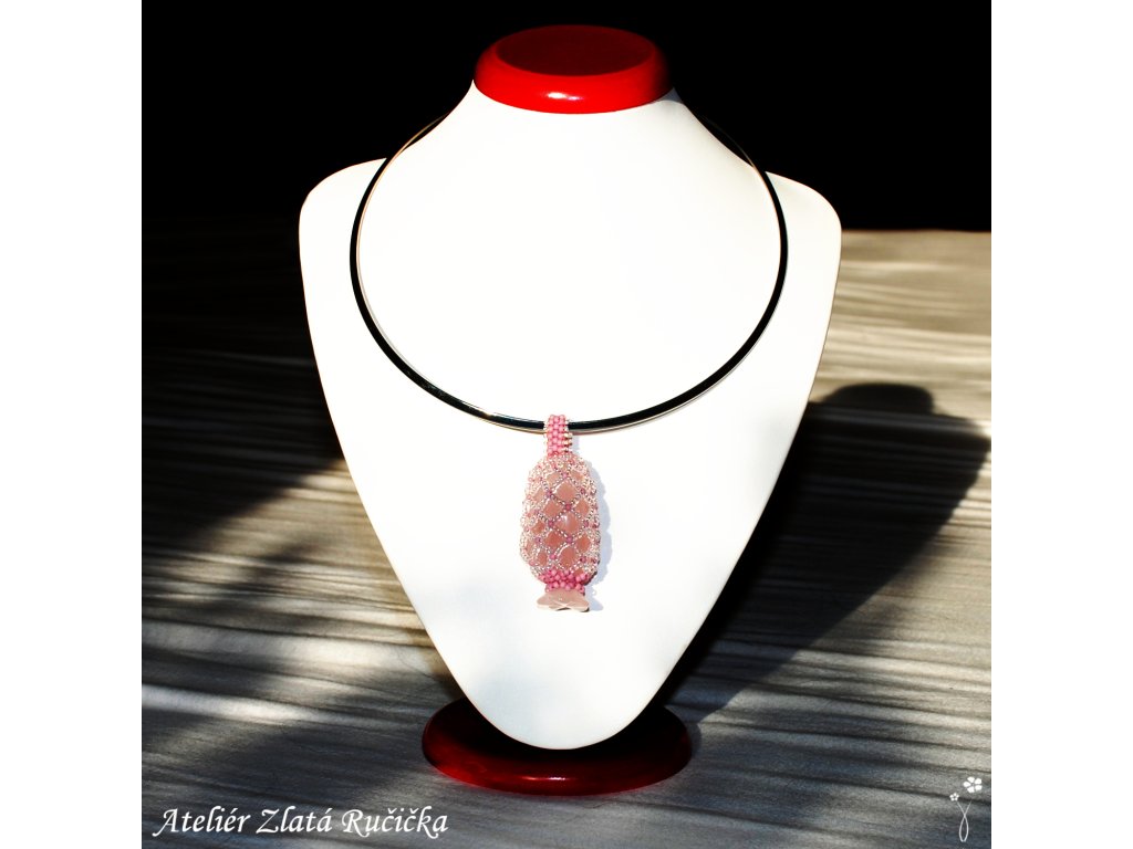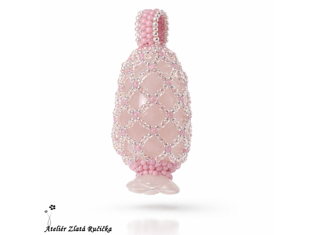 Protáhlý tromláček růženínu je uložen v šité síťce ze skleněných rokajlových korálků. Korálková síťka přívěsku je dole uzavřena kamenným kvítkem vyřezaným také z růženínu. Amulet je zavěšen na pružném ocelovém kruhu s jednoduchým stiskacím uzávěrem.