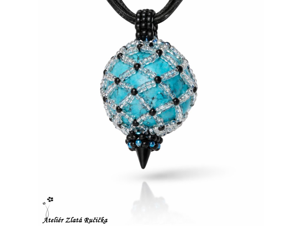 Tromlovaný kámen tyrkenitu je uložen v šité síťce ze skleněných rokajlových korálků. Přívěsek je dole ozdoben několika drobnými korálky a je zavěšen na ozdobném závěsu z bavlněné tužené šňůrky a monofilové stužky. Uzavírá se na karabinku z bižuterního kovu