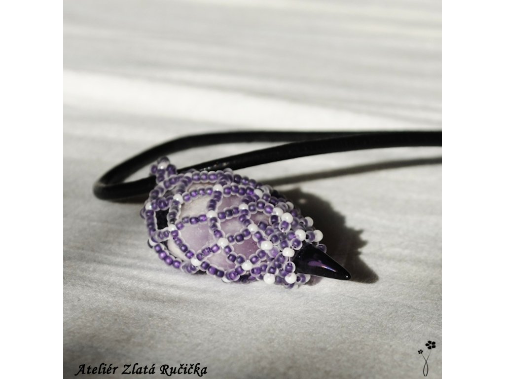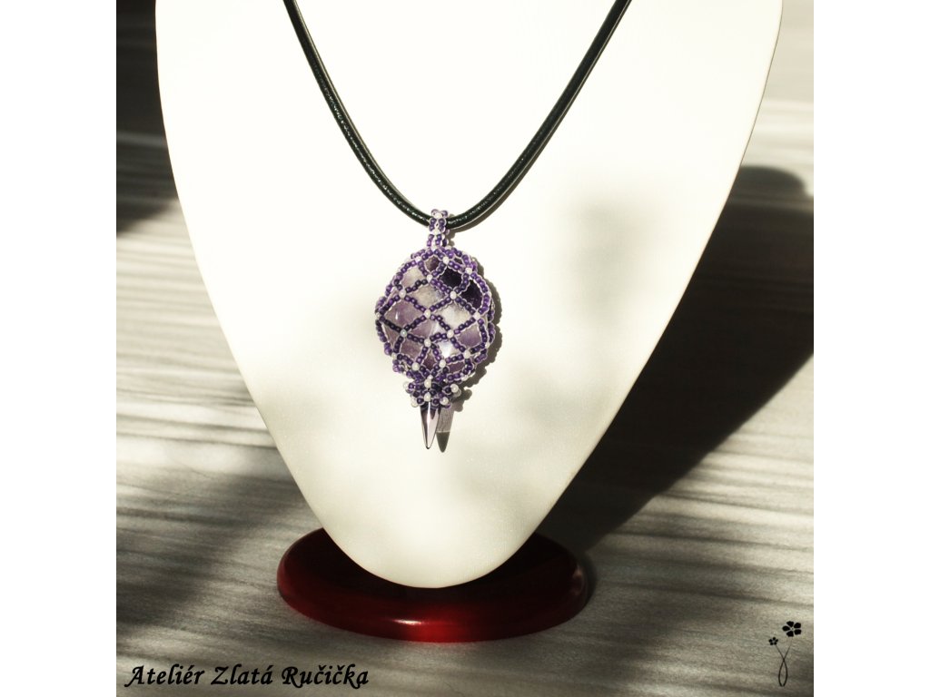 Nepravidelný valoun ametystu je uložen v síťce ušité ze skleněných rokajlových korálků. Korálková síťka přívěsku je dole uzavřena velkým špičatým korálkem zvaným spike. Amulet je zavěšen na černé kulaté kůži. Uzavírá se jednoduchým zapínáním z tibetského stříbra