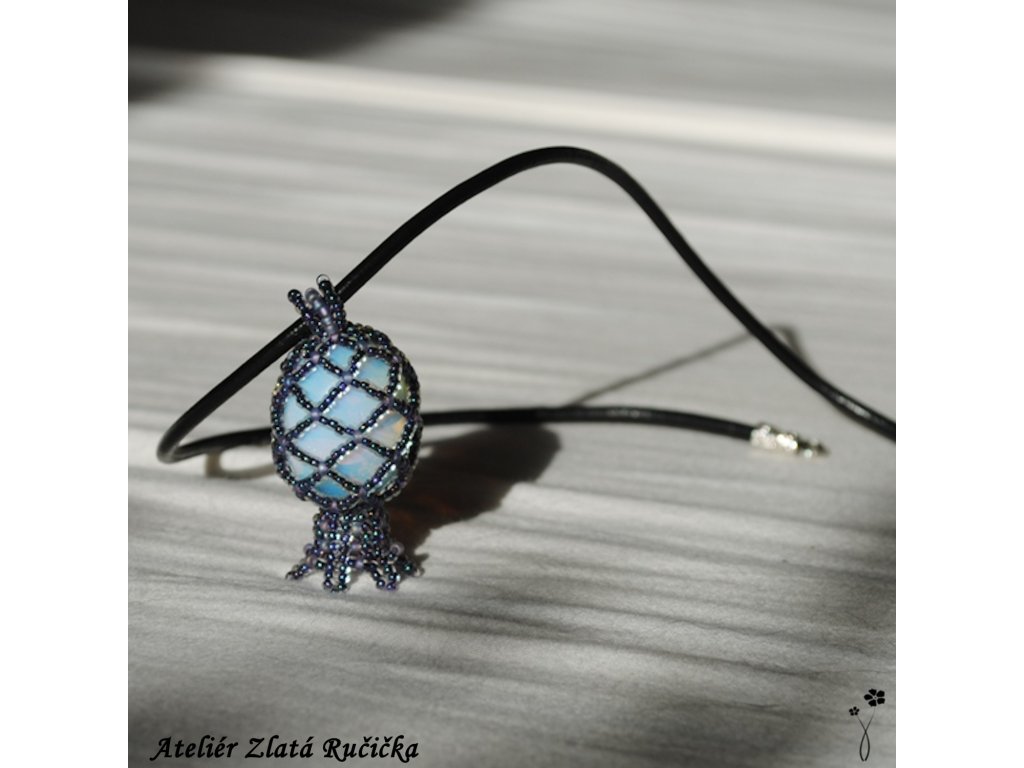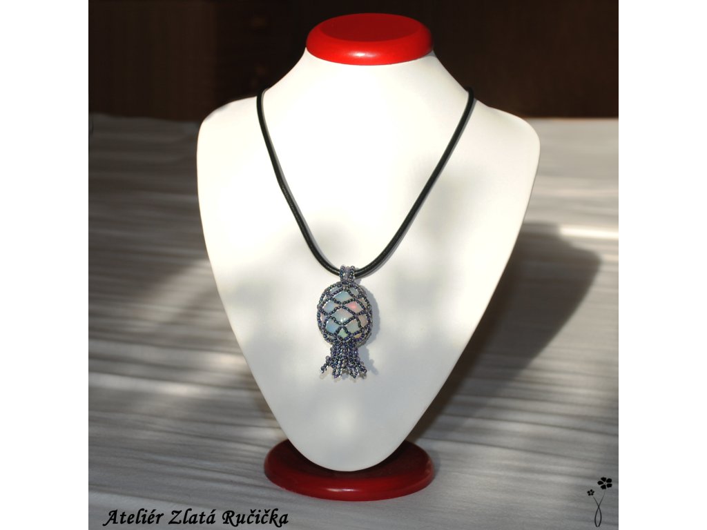 Hladký skoro kulatý valoun opalitu je uložen v šité síťce ze skleněných rokajlových korálků. Korálková síťka přívěsku dole přechází do malého zvonečku. Amulet je zavěšen na černé kulaté kůži. Uzavírá se jednoduchým zapínáním z tibetského stříbra