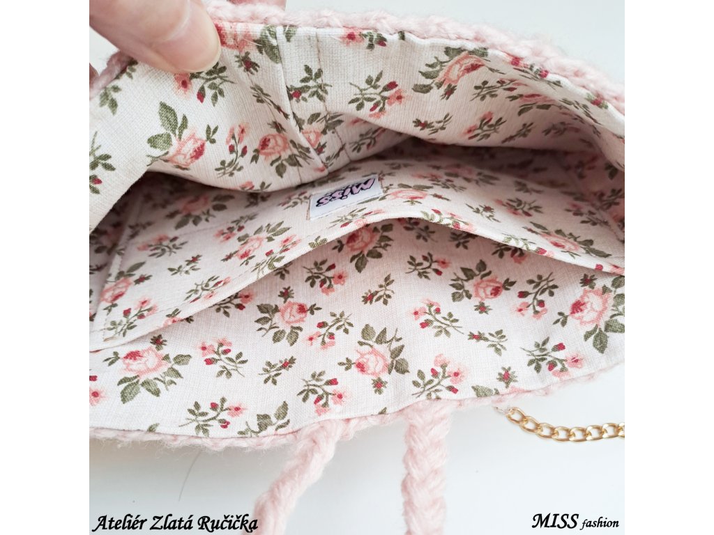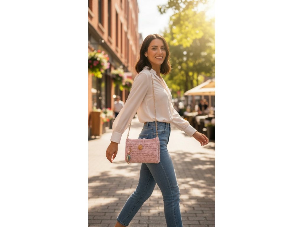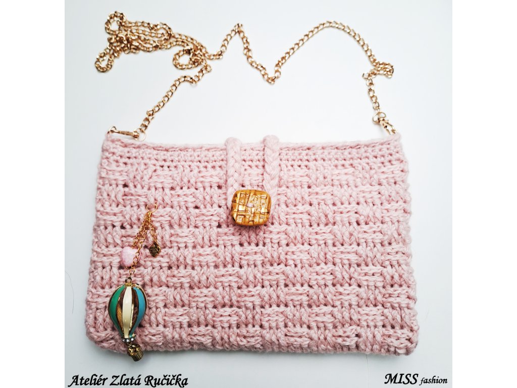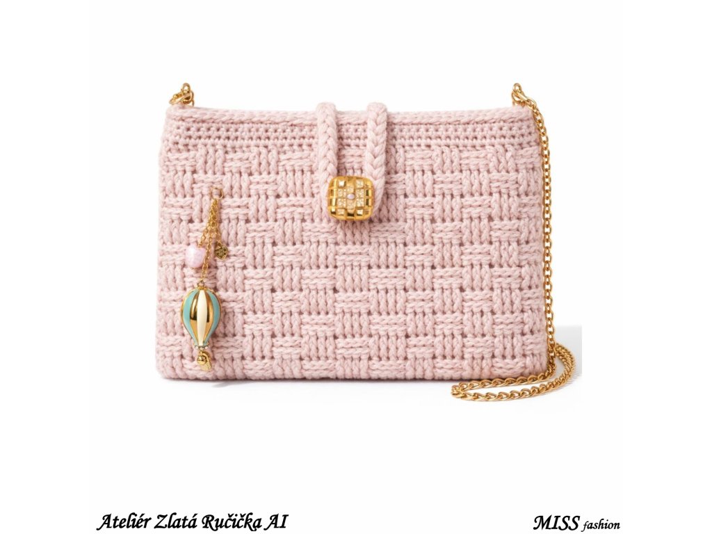 Ručně háčkovaná kabelka v jemné růžové barvě je dokonalý doplněk pro chvíle, kdy chcete být elegantní a zároveň originální. Díky zlatému řetízku působí luxusně a zároveň si zachovává jemný, romantický vzhled.
