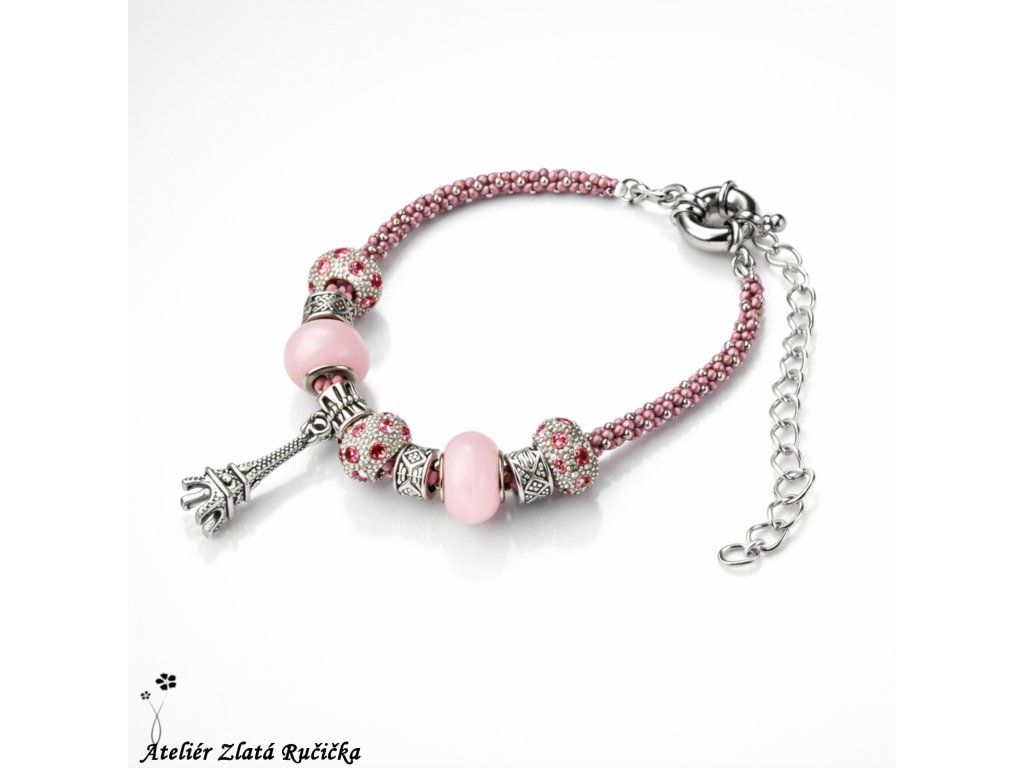 Náramek z růžového a stříbrného japonského rokajlu TOHO nejmenší velikosti, zdobený růžovými korálky euro s fazetováním, stříbrnými korálky vykládanými růžovými kameny, několika spacery a přívěskem ve tvaru Eiffelovy věže - symbolu Paříže.
