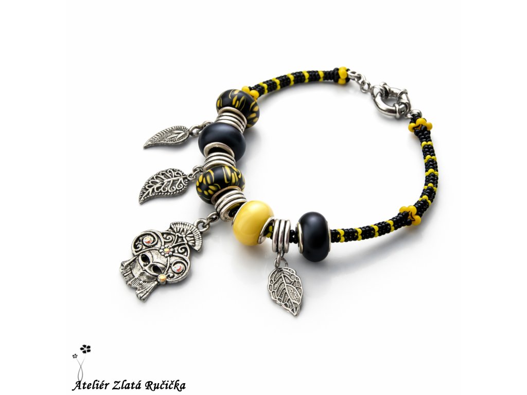 Náramek z černého a žlutého japonského rokajlu TOHO nejmenší velikosti, zdobený černými a žlutými euro korálky, několika spacery, přívěsky ve tvaru lístků a větším přívěskem zpodobňujícím karnevalovou masku.Náramek stylem připomíná náramky Pandora, na rozdíl od nich má ale barevně sladěný náramkový základ.