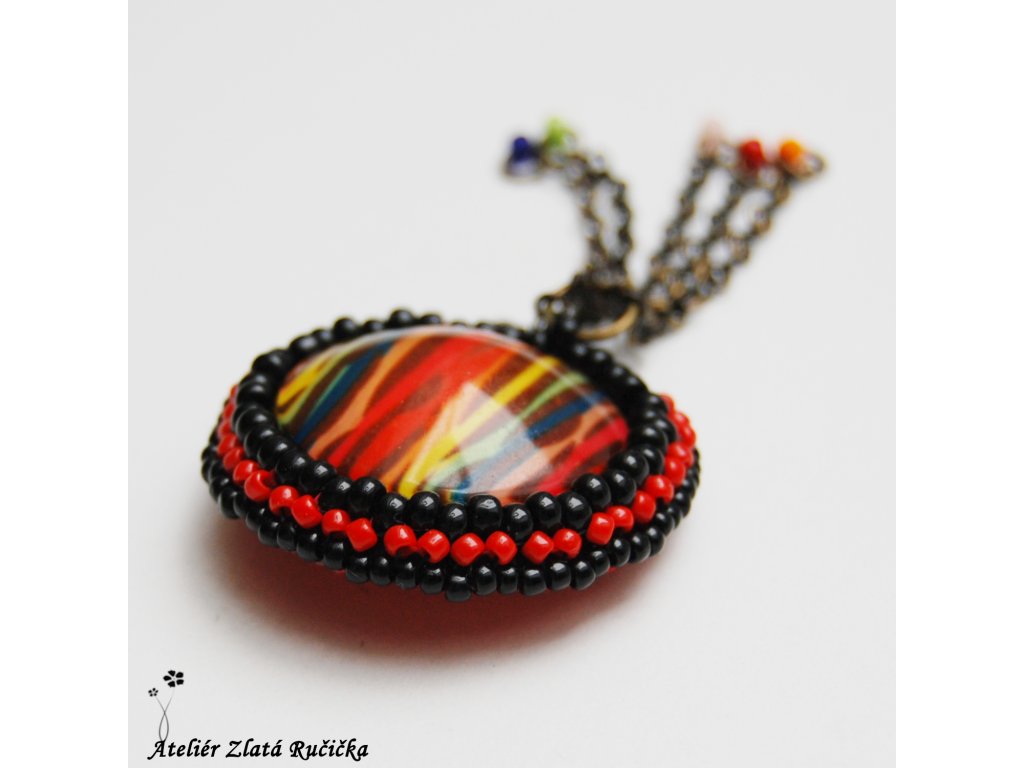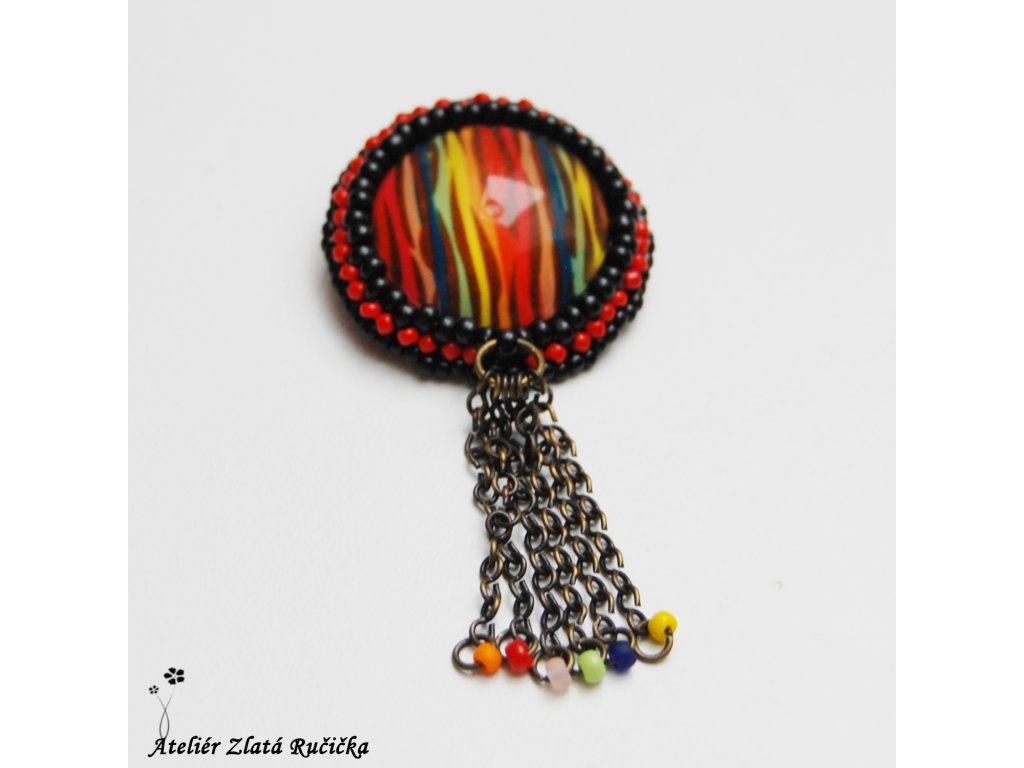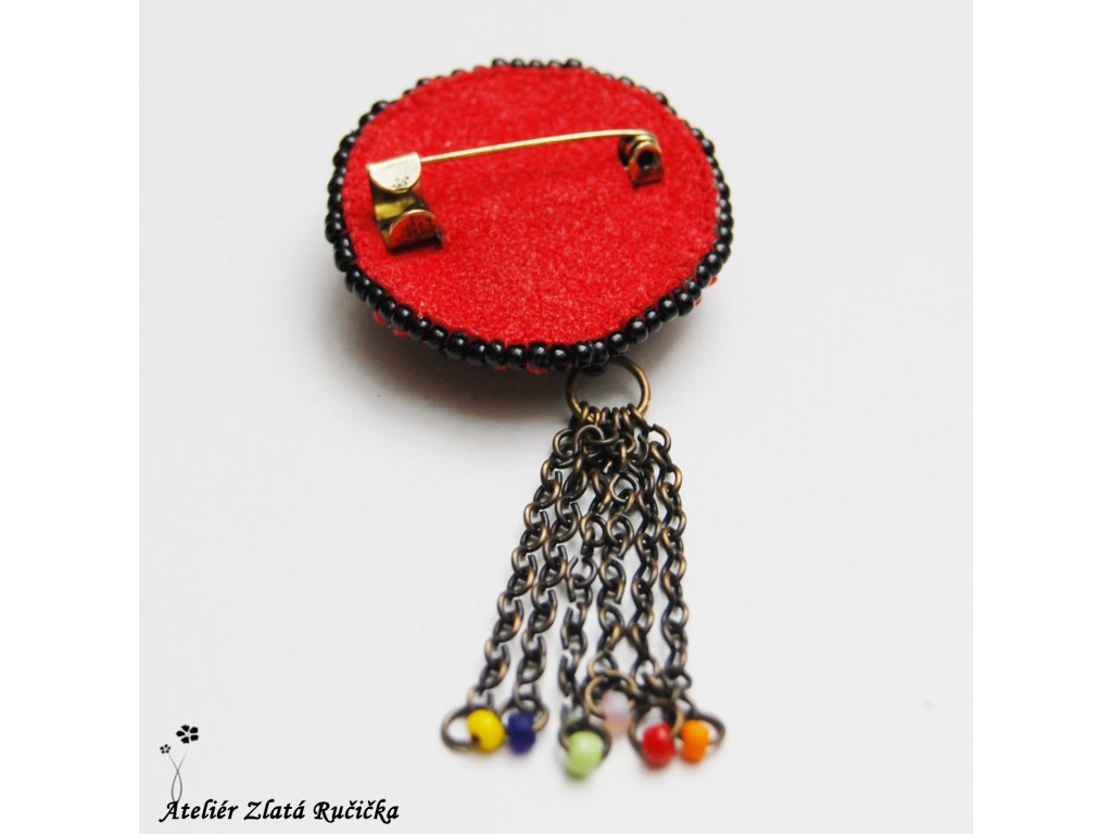 Brož vytvořená technikou šitého šperku. Barevný kabošon uprostřed je obšitý rokajlem v barvách červená a černá.Z brože visí řetízky zakončené korálky v barvách středového kabošonu.