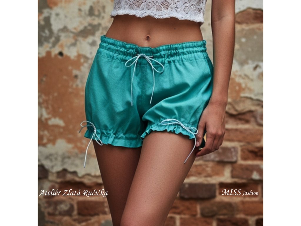 Kraťásky z tyrkysového bavlněného voálu, což je látka o poznání lehčí a jemnější než plátno. Model je poněkud minimalistický bez krajek, zdobí jej pouze saténové šňůrky. Vhodné jako sexy domácí oděv nebo noční prádlo. Skvělý dárek pánové pro partnerku nebo dámy pro kamarádku, dceru, vnučku...
