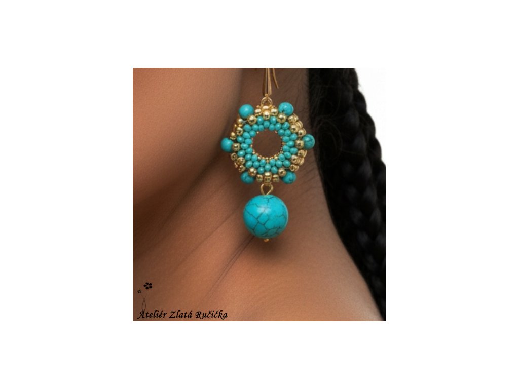 Druhé náušnice z kolekce NEFERTITI. Opět kombinace tyrkysové se zlatou, jejíž lesk zvýrazňuje kontrast mezi rokajlem jiskřivě zlatě lesklým a tyrkysovým s matnou povrchovou úpravou. Kruhy jsou stylově doplněny korálky z tyrkenitu a elegantními háčky ve zlaté barvě.
