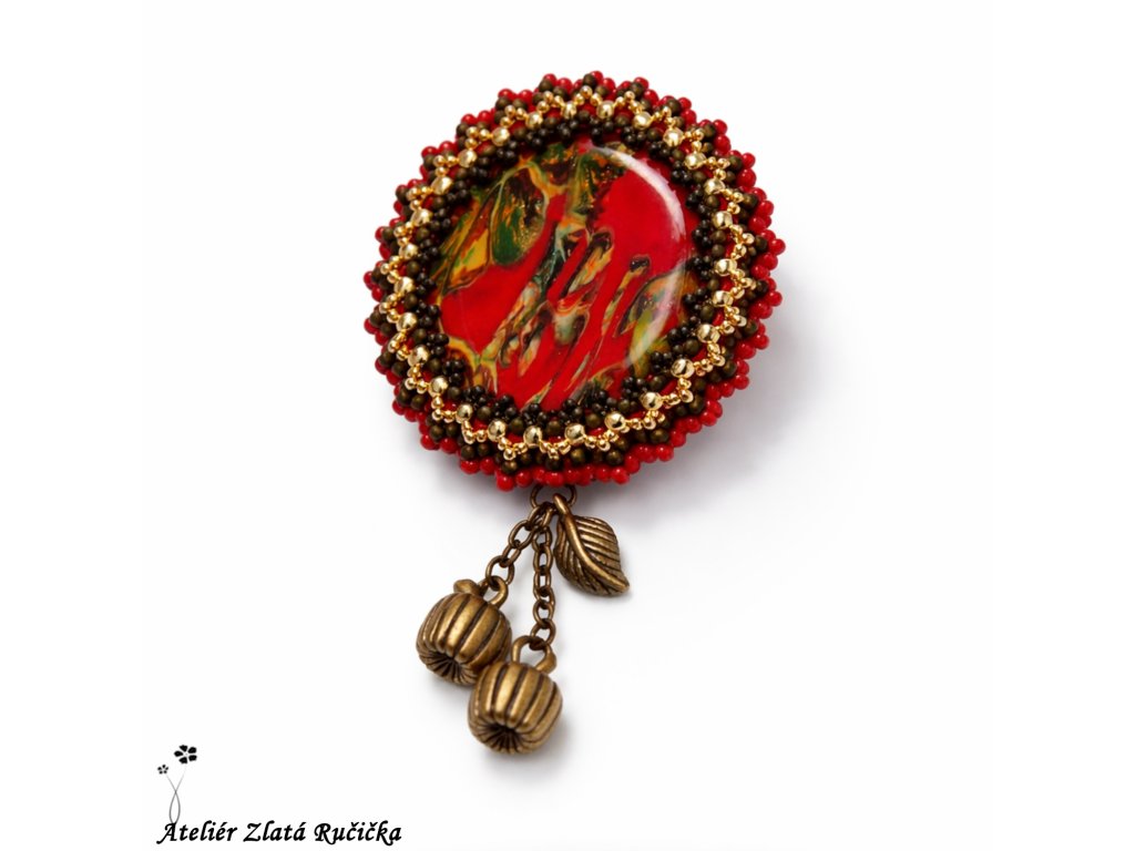 Fimošon uprostřed je obšitý rokajlem v barvách červená, olivová a zlatá a ozdobený přívěskem dvou dýní ve starozlaté barvě (bižuterní kov).
