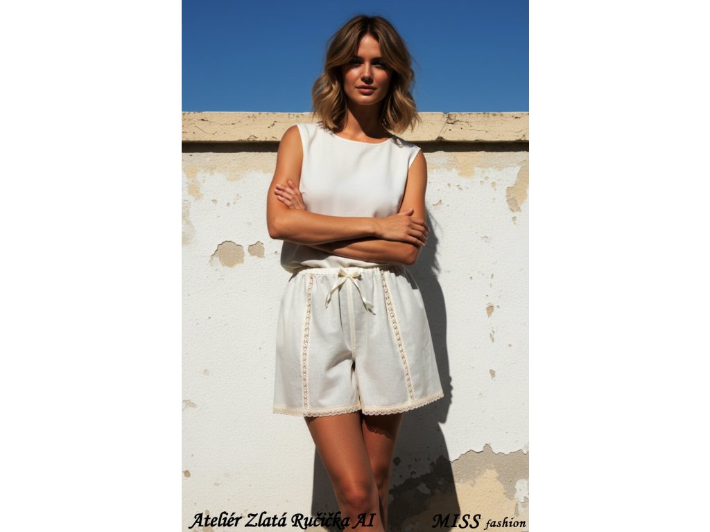 Kalhotky jsou ušity z recy bavlněného plátna. Látka byla použita na zkušební model šatů, pak vyprána, vyžehlena a teď jsou z ní tyto luxusní kalhotky. Velmi pečlivě vypraované prostřihy zdobí celkem šest krajkových vsadek. Střih je do pasu.