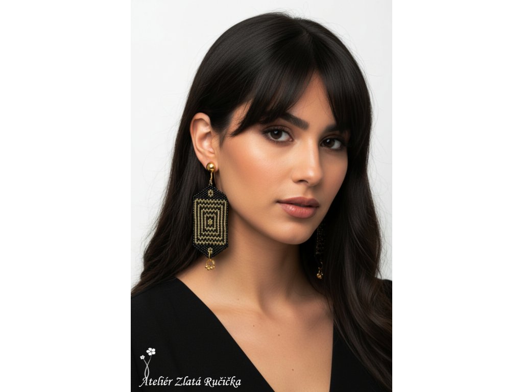 Velké náušnice KLEOPATRA se svými rozměry opravdu řadí k těm největším, které v Ateliéru Zlatá Ručička najdete. Vyrobené jsou opět technikou beadweaving stehem peyote, který skýtá stále nové a nové možnosti - však jej také ráda a často využívám. Náušnice zdobí velmi netradiční přívěsek z několika kroužků a korálků doslova "všitý " do náušnice.
