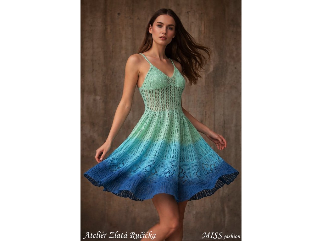 Vzdušné letní šaty pro výjimečné příležitosti. Jejich barva připomíná mořskou vodu a jemný vzor exotické končiny. Originální je řešení spodničky prostřednictvím barevně sladěných pohodlných kraťasů - bloomerek.